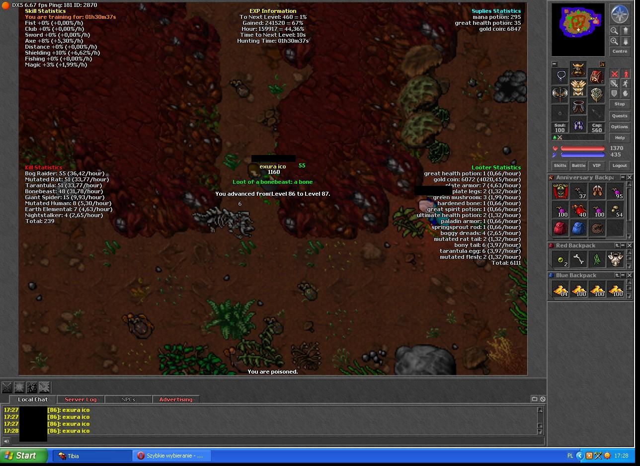 Jest mało tematów na tym forum, które są regularnie prowadzone, więc stwierdziłem że założe swój, aby ożywić trochę to forum. Na razie mam facc, ponieważ maturka za niedługo i przez pacc nic się nie uczyłem bo grałem na druidzie. Z facc puszczam knighta i idę się uczyć. Knight ma 85 lvl, a druid 103 (jak znajde chwilę to wrzucę skille). Mamy exp x2 więc knightem przerzuciłem się z corymów carlin, na których miałem ok. 50k/h, na Robson isle na której miałbym normalnie 90k/h (x2 mam 170-180k/h). Nie wiem czemu, ale za szybko screeny mi bot robi. Będę starał się recznie robić. Tu (prawie) 85 lvl knighta i loocik z Old Widow jak jeszcze mialem pacc.