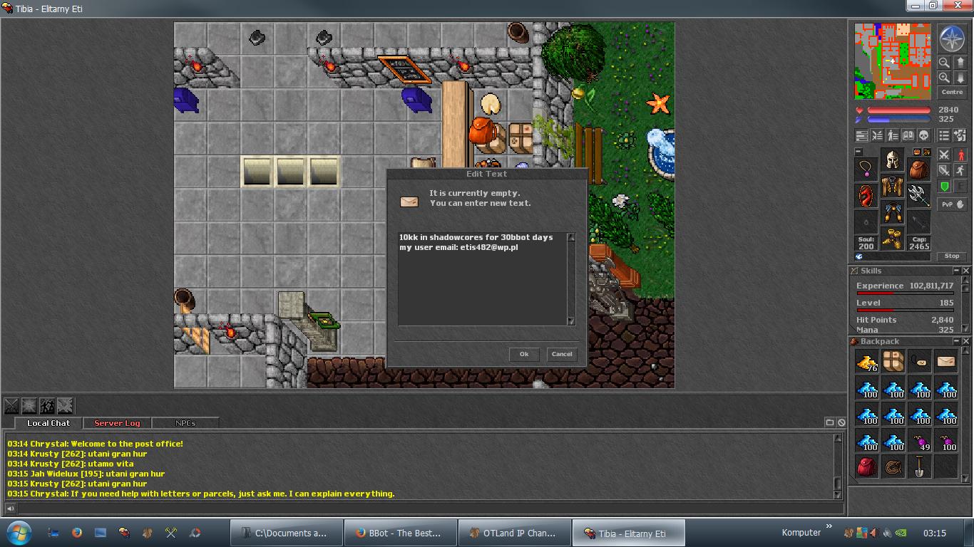 1 guy wrote to me today about script. He offered me 220 rp + 100 ms for 1 script. I did checked account created today so what? Scammer 100% XD He said hasn't r key. When he gave me passwords I did checked char is ok went to dragon spawn left with 7 hp and log out. I modified script that the bot will drop eq somewhere after few rounds ![]() What happend? I did send script (modified not oryginal) kicked from account and wrong passwords. I think 1 died on 220 rp + lost eq from knight on brimstone bugs and died there as well will learn him and may be in future he won't do it again. Of course I wanted send him good working script after 30-40 minutes I did it because no1 normal guy offer character worth 100+ usd for script 5 usd Good Blessings Sir [email protected]