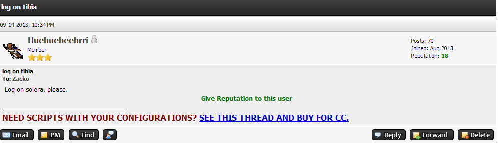 This is his msg in forum And this is the photo that he give to me in that msg EDIT: I have more photos (acc,etc...) This is another msg from him This is one post from Huehueberri.. in forum asking for help because he didnt receive his 15 days code (he just thief me 15 days for 180k) And this is my account right now (i dont know if admins etc have acces to accounts in bbot page, but my account hotmail is [email protected] so thhere you can see that this photo is 100% real, if you have acces to our accounts of course.) I think its enough evidences, im not a bad forum member i just had bought 3 scripts from xlesiu and i dont have problems with him so you can ask him about me too ( i have skype conversations with xlesiu in skype so i can take photos and you can see that im not a thiefer) (09-16-2013, 05:46 PM)Huehuebeehrri Wrote: Lol? I will sended and all its ok =)You dont send me nothing, you just thief me 180k and now you dont talk with me just ignoring me in game, you dont send me nothing there's a photo of my account state right now.