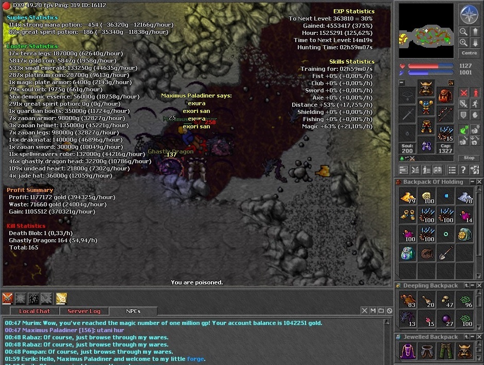 Remember: i'm not professional on this and Shadowcores is a full Otserv, so NEVER STAY AFK, will have many PK Team and Lurers, you can die (This script have a protector, to run PZ place if attacked by players, but need test). You can die by 3 ghastly if you is a low lvl