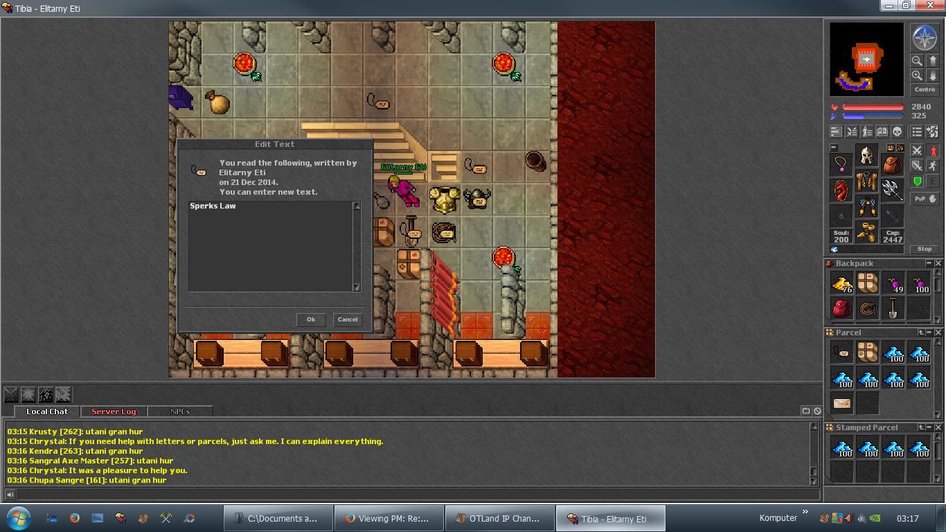 1 guy wrote to me today about script. He offered me 220 rp + 100 ms for 1 script. I did checked account created today so what? Scammer 100% XD He said hasn't r key. When he gave me passwords I did checked char is ok went to dragon spawn left with 7 hp and log out. I modified script that the bot will drop eq somewhere after few rounds ![]() What happend? I did send script (modified not oryginal) kicked from account and wrong passwords. I think 1 died on 220 rp + lost eq from knight on brimstone bugs and died there as well will learn him and may be in future he won't do it again. Of course I wanted send him good working script after 30-40 minutes I did it because no1 normal guy offer character worth 100+ usd for script 5 usd Good Blessings Sir [email protected]
