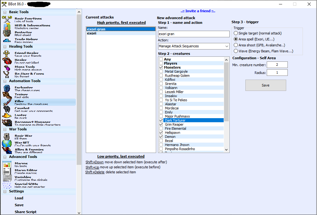 I have already set the name of the creatures at Killer options, have set up the Attack Sequence using wait ms for each spell but it doesn't work properly.