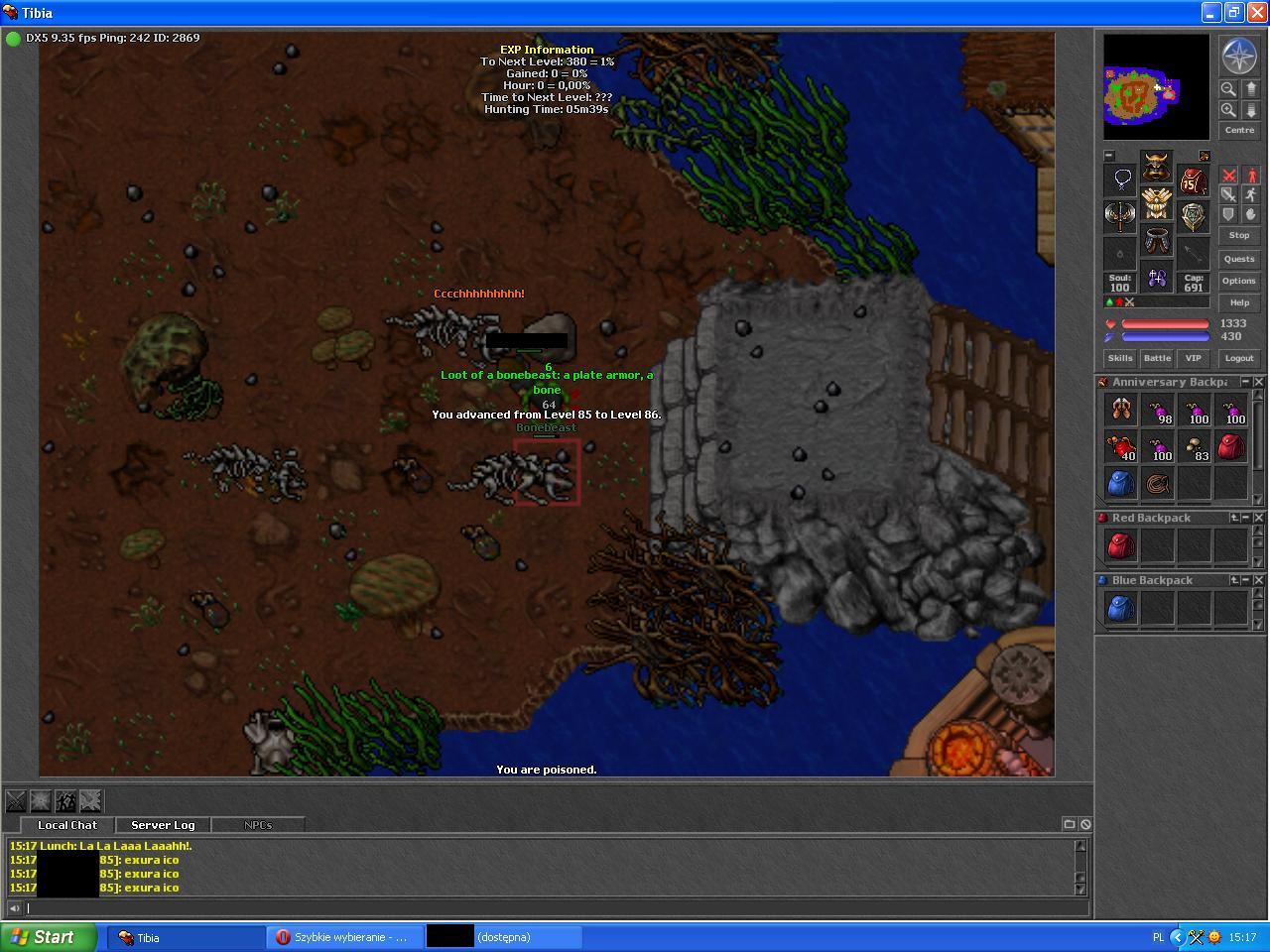 Jest mało tematów na tym forum, które są regularnie prowadzone, więc stwierdziłem że założe swój, aby ożywić trochę to forum. Na razie mam facc, ponieważ maturka za niedługo i przez pacc nic się nie uczyłem bo grałem na druidzie. Z facc puszczam knighta i idę się uczyć. Knight ma 85 lvl, a druid 103 (jak znajde chwilę to wrzucę skille). Mamy exp x2 więc knightem przerzuciłem się z corymów carlin, na których miałem ok. 50k/h, na Robson isle na której miałbym normalnie 90k/h (x2 mam 170-180k/h). Nie wiem czemu, ale za szybko screeny mi bot robi. Będę starał się recznie robić. Tu (prawie) 85 lvl knighta i loocik z Old Widow jak jeszcze mialem pacc.