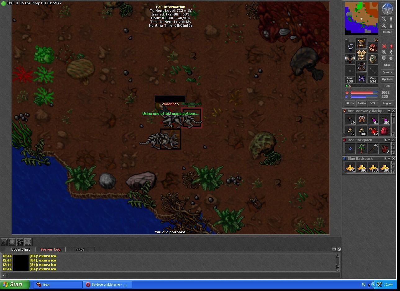 Jest mało tematów na tym forum, które są regularnie prowadzone, więc stwierdziłem że założe swój, aby ożywić trochę to forum. Na razie mam facc, ponieważ maturka za niedługo i przez pacc nic się nie uczyłem bo grałem na druidzie. Z facc puszczam knighta i idę się uczyć. Knight ma 85 lvl, a druid 103 (jak znajde chwilę to wrzucę skille). Mamy exp x2 więc knightem przerzuciłem się z corymów carlin, na których miałem ok. 50k/h, na Robson isle na której miałbym normalnie 90k/h (x2 mam 170-180k/h). Nie wiem czemu, ale za szybko screeny mi bot robi. Będę starał się recznie robić. Tu (prawie) 85 lvl knighta i loocik z Old Widow jak jeszcze mialem pacc.